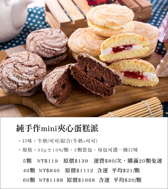 平均每顆最低只要20元起即可購得純手作mini夾心蛋糕派5顆/40顆/60顆(32g10%/顆,5顆裝包),口味:牛奶/可可/綜合(牛奶+可可),購滿20顆即享免運優惠!